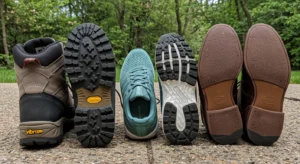 Lugged rubber soles, particularly Vibram, are the best for hiking because they provide grip, durability, and protection.
